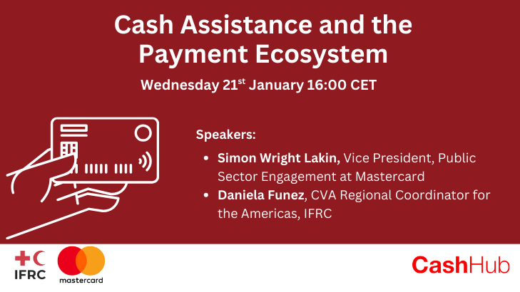 The Cash Hub is excited to share that the next webinar topic will look at Cash and Voucher Assistance within the Payment Ecosystem; we will be joined by guest expert Simon Wright Lakin from Mastercard, who will walk us through the ‘4 party payment model’ and the roles and responsibilities of each party within the global Payment Ecosystem. We will also hear from Daniela Funez from the IFRC on some of the tools and resources available to help Movement practitioners navigate some of the challenges they may face within the Payment Ecosystem.